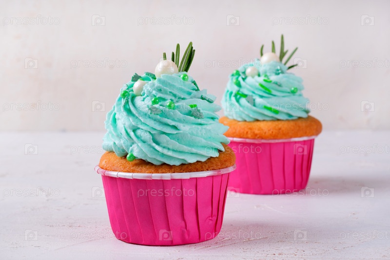 Рождественские кексы с зеленой глазурью, украшенные сахарными порциями и розмарином в розовой чашке. десерт подается со льдом. празднование Нового года и зимних каникул