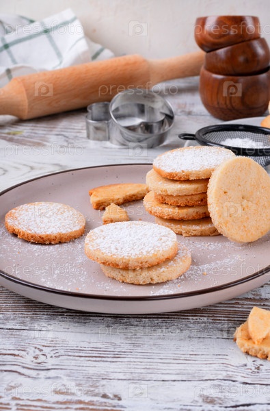 Короткие круглые печенье из хлеба, покрытые сахарным порошком на тарелке на деревянном столе