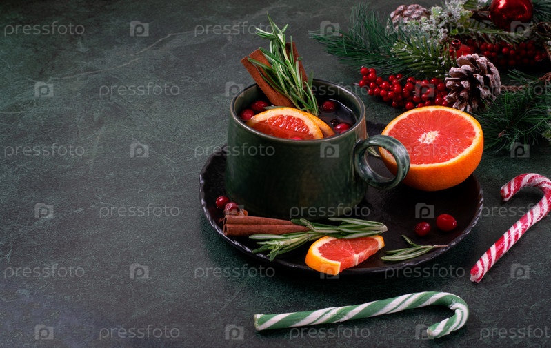 Глюлевое вино подается с красным апельсином, корицей, клюквенкой и розмарином в зеленой керамической кружке на темном столе