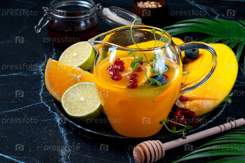 Фруктовый коктейль и различные тропические фрукты, подаваемые на темной тарелке: манго, виноград, лайм, апельсин, черника, семена граната, сосновые орехи и мед