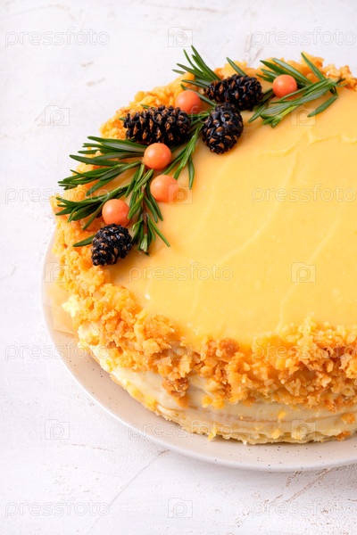 Торт с лимонным творогом и сливкой, украшенный кондированными сосновыми шишками, розмарином и сахаром посыпается на белом столе