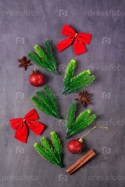 Рождественская плоская композиция с смоковницами и ювелирными украшениями на темно-сером столе