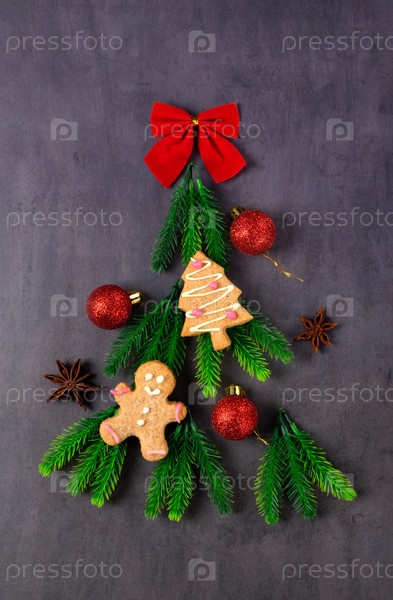 Композиция с рождественской елкой, состоящая из ветвей елей, имбирного хлеба и ювелирных украшений на тёмно-сером фоне
