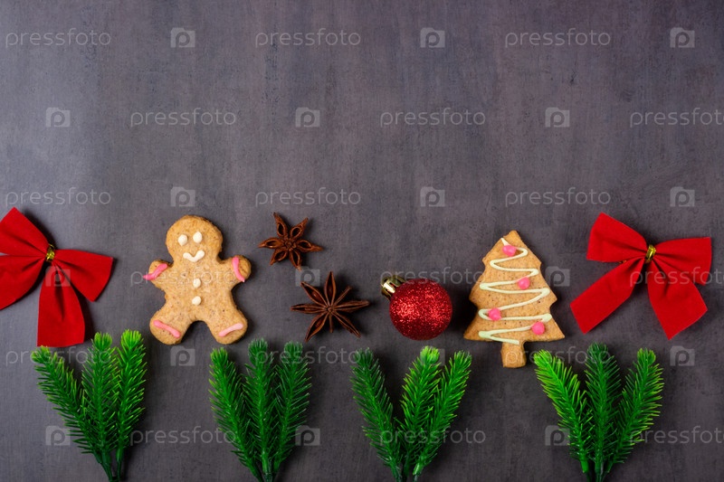 Праздничная композиция из финиковых ветвей, печенье с пряником, специи и ювелирные изделия на тёмно-сером фоне