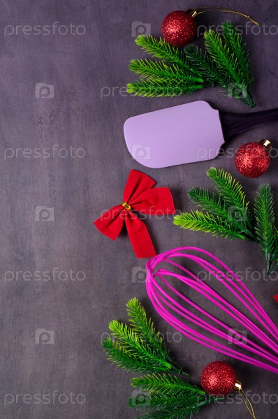 Рождественская композиция с кухонными инструментами для выпечки, веточками пихты и ювелирными изделиями на темно-сером столе. Силиконовый виски и лапатка. Праздничная композиция. Копирование пробела