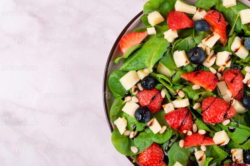 Салат со земляницами, шпинатом, чернилами, сыром кацитта и сосновыми орехами в бальзамическом глазе. Здоровая еда. Вид сверху, копирование пространства