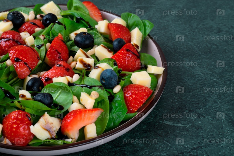 Салат со земляницами, шпинатом, чернилами, сыром кацитта и грецкими орехами в бальзамической глазури на темно-зеленом столе