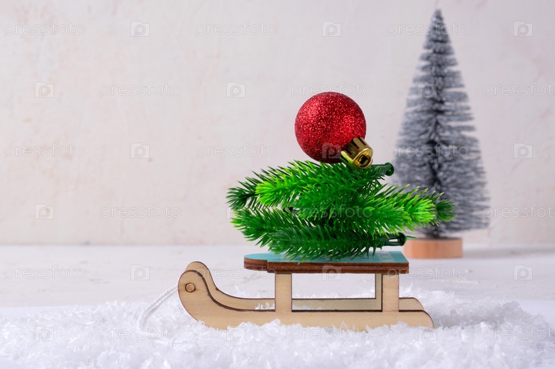 Красная рождественская елка и финиковые ветви на игрушечных деревянных санях в искусственном снегу. Дерево на заднем плане на светлом фоне. Праздничное зимнее развлечение, подготовка к празднику