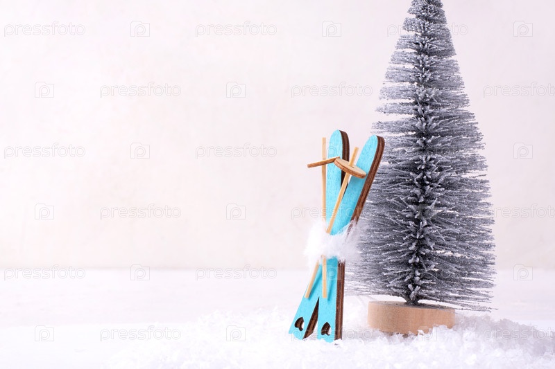 Голубые деревянные лыжи у рождественской елки на белом фоне Зимние виды спорта Мокапи с копией космоса