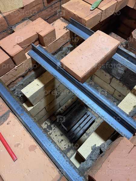 Установка потолка тепловой плиты кирпичами на металлических углах.Строительство отопительной печи