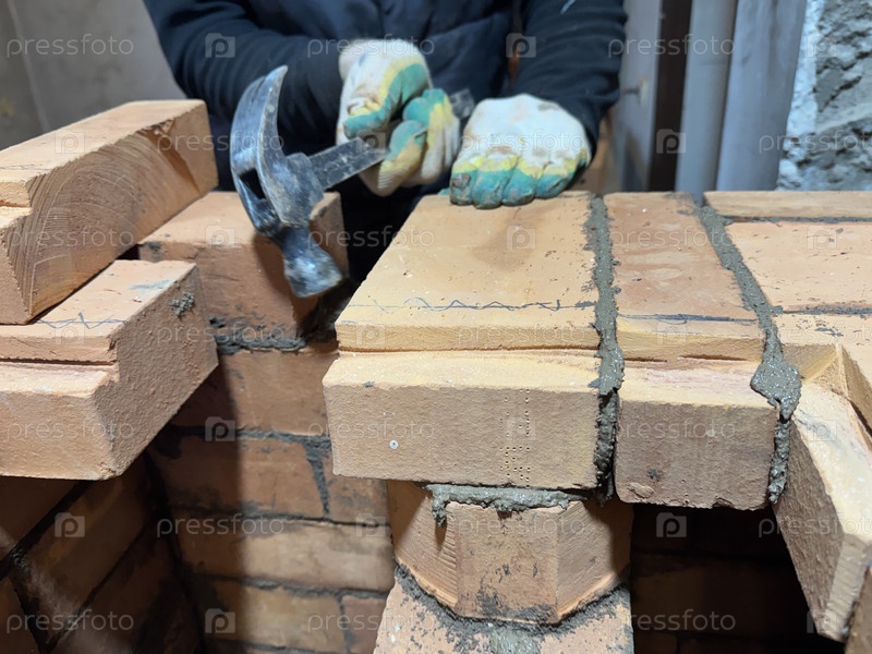 Столешница регулирует наложенный кирпич молотком. Кирпичная плита для отопления. Каналы для разделения и пропускания дыма. Закрыть