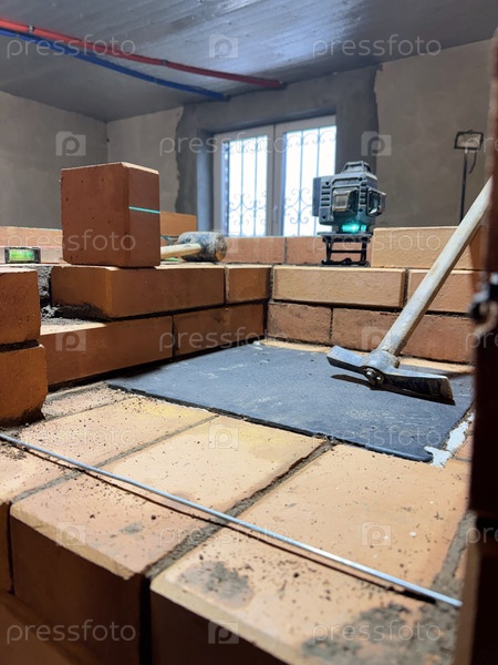 Установка плиты для приготовления пищи на подогревную печь. кирпичная работа в строительстве отопительной печи. инструменты разложены вокруг