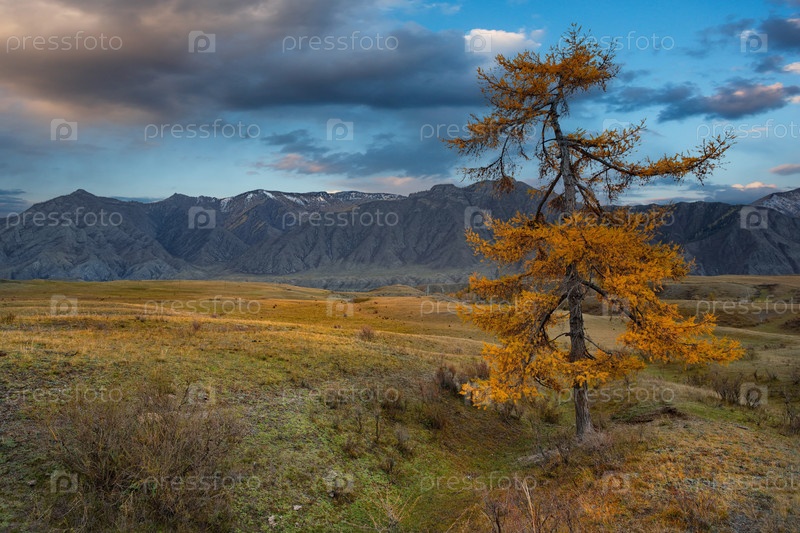 Россия.Западная Сибирь, Алтайские горы.Одинокая осенняя личинка в долине реки Катун, окруженная горными хребтами возле деревни Инеген