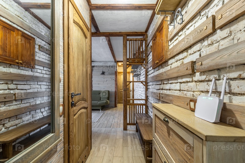 Деревянный внутренний коридор с кирпичной стеной и WiFi-маршрутизатором