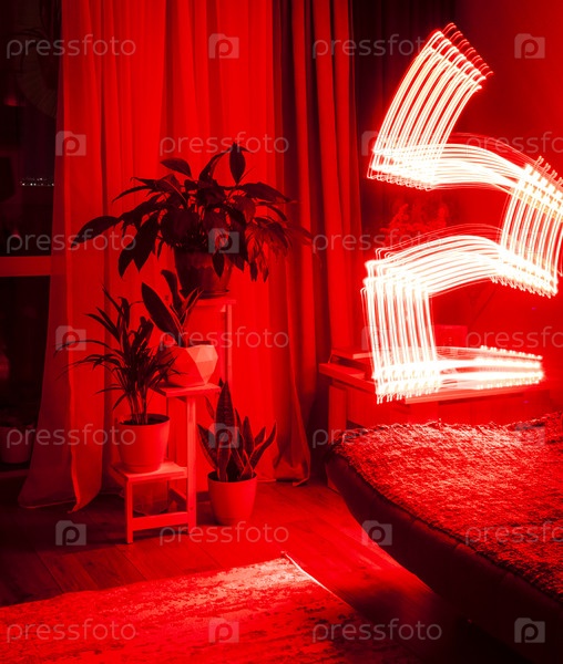 Длинная фотография, которая фиксирует путь движущегося источника красного света в слабо освещенной комнате