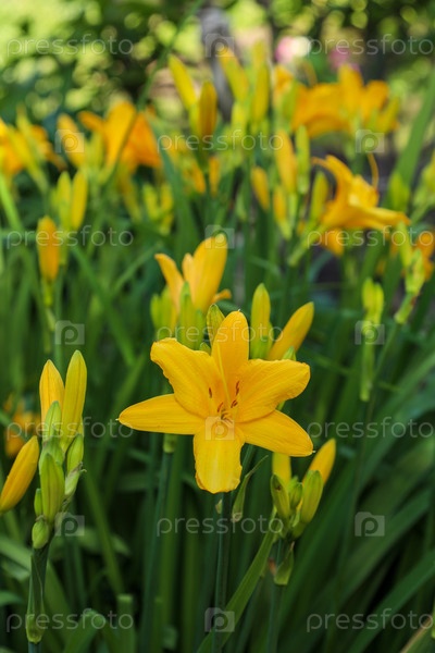 Желтая лилия цветет в летнем саду