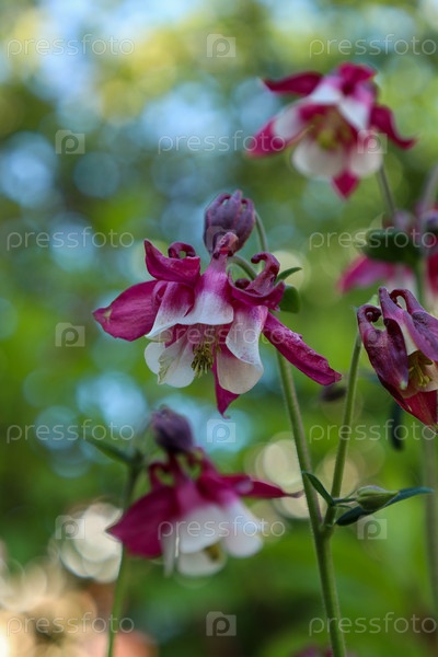 Цветок водосбора оригинального цвета - часть лепестков белая, край красный, цветет на размытом фоне