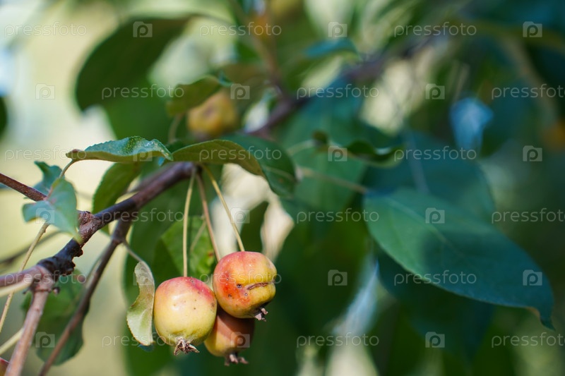 Плоды диких яблони на фоне зеленых листьев