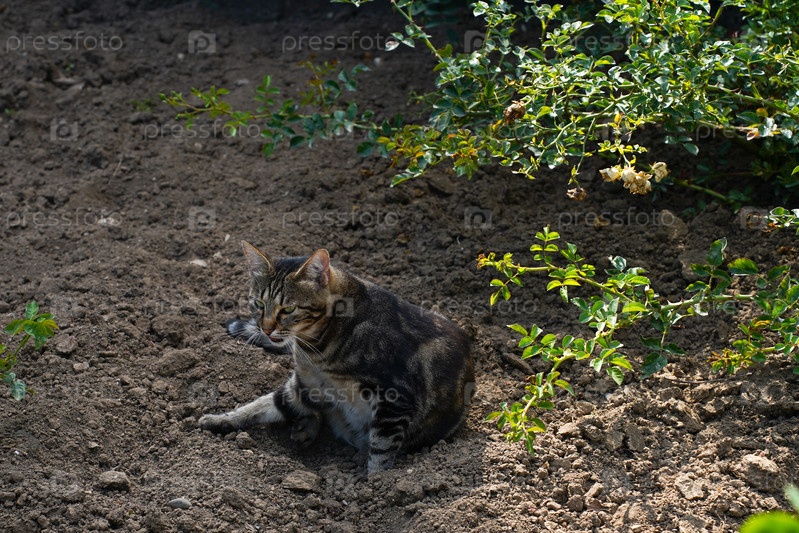 Трехцветный кот лежит на земле