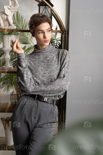 Красивая молодая женщина позирует в сером свитере в студии