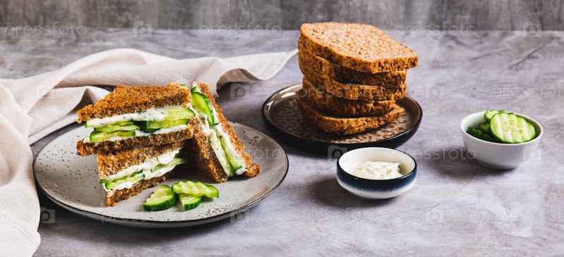 Огуречный бутерброд с маслом и сливочным сыром на тарелке на столе веб-баннер
