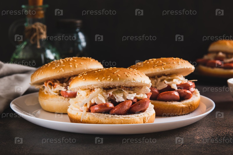 Нью-Йоркские булочки с колбасой и уксусом на тарелке на столе
