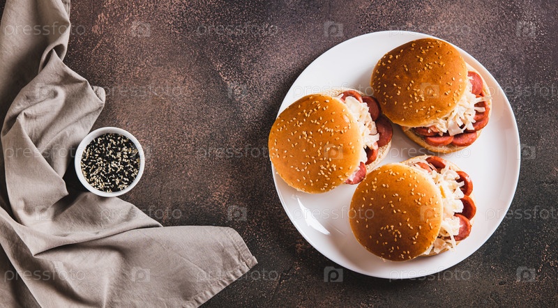 Бургеры с жареной колбасой и колыбелью на веб-баннере с видом на тарелку