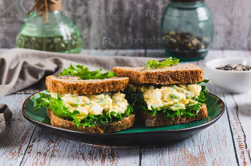 Сэндвич из яичного салата с авокадо на цельнозерновом хлебе на тарелке