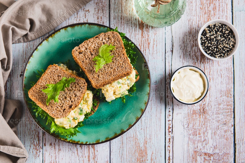 Сладкий яичный салат с бутербродом из авокадо на цельнозерновом хлебе на тарелке top view