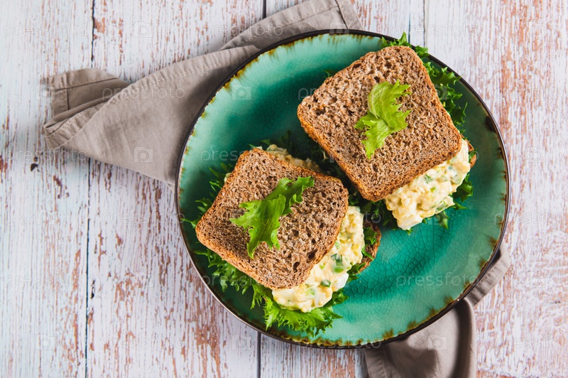 Закройте бутерброд соленого салата с яйцами и авокадо на цельнозерновом хлебе к тарелке с видом вверх