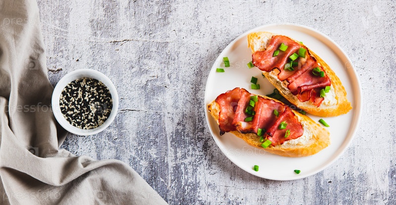 Выпеченная бруцетта с рикотой и беконом на тарелке на столе