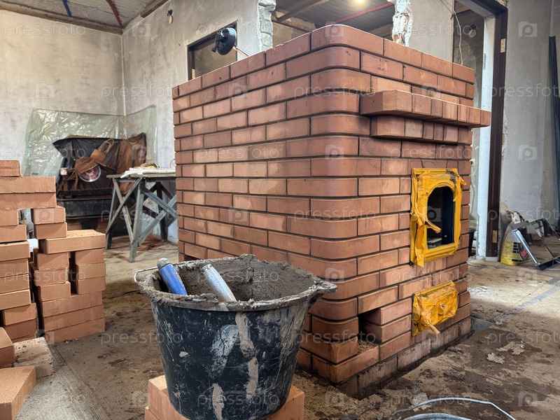 Строительство отопительной печи. Пепельная кастрюля и дверь духовки завернуты в ленту. Видна полка для плиты. Вблизи находятся инструменты и материалы для установки тарелок