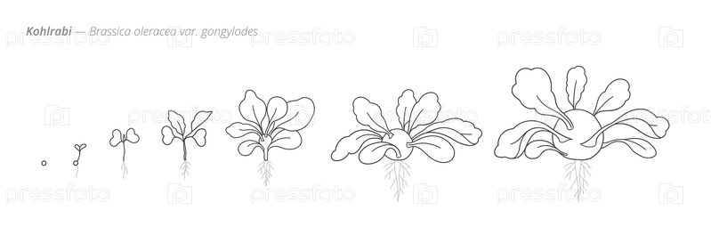 Подробная монохромная иллюстрация векторной диаграммы фаз роста кохраби, от раннего саженца до зрелости урожая