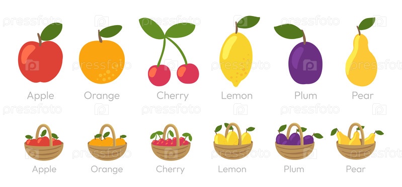 Красочное отображение различных фруктов, включая яблоки, апельсины, вишни, лимоны, сливы и груши в корзинах