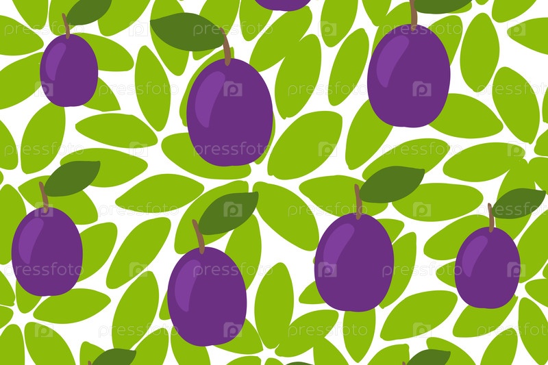 Красочный рисунок фиолетовых слив и зеленых листьев на белом фоне, показывающий красоту в простом дизайне