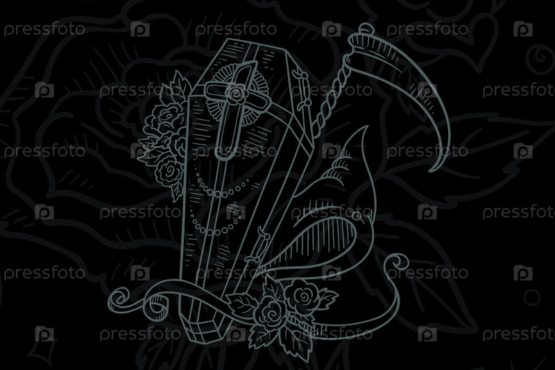 Творческий дизайн представляет собой гроб, украшенный розами и косы на черном фоне. произведения искусства показывают сложные узоры в готическом стиле