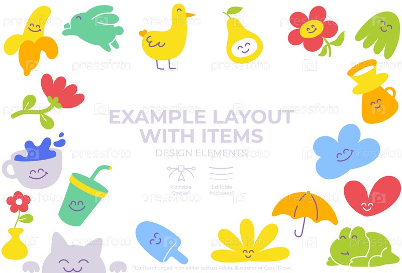 Веселое расположение красочных элементов дизайна демонстрирует улыбающихся персонажей и предметы, вдохновленные природой.Эта живая компоновка идеально подходит для детских занятий и ремесел