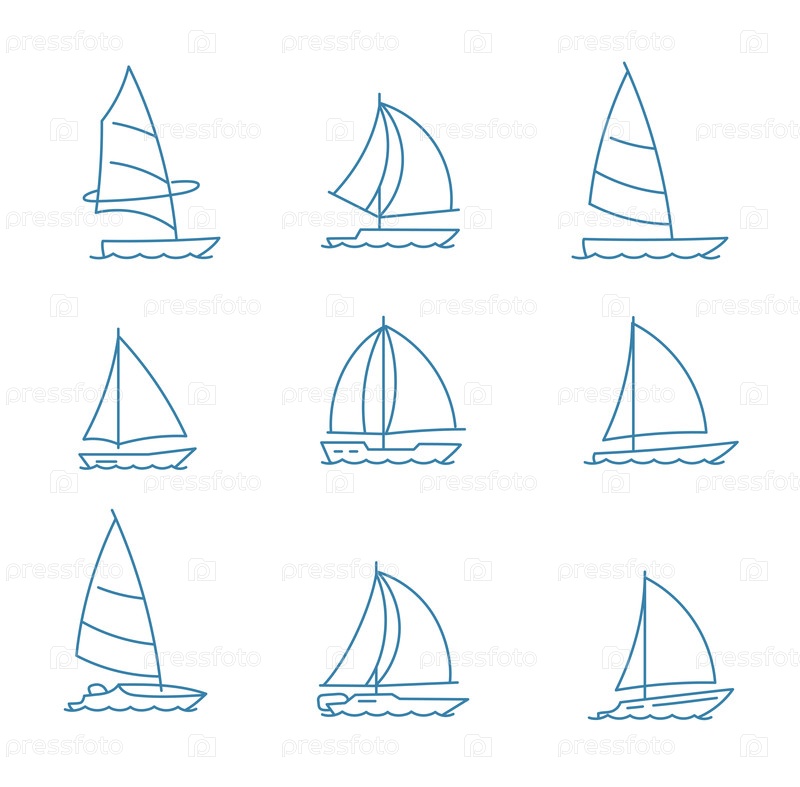 Девять уникальных икон парусника расположены в сетке с различными конфигурациями паруса, каждая из которых предназначена для простого редактирования и настройки в дизайнерских проектах или иллюстрациях