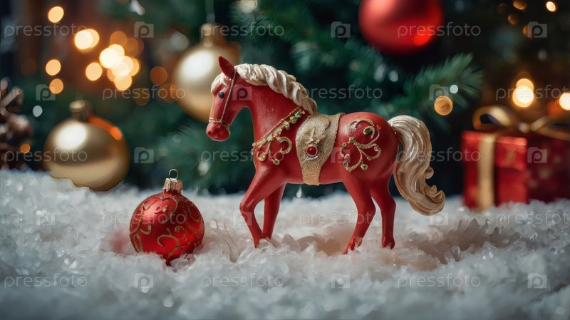 Новогодняя открытка 2026 года с красным огненным конем. Рождественская елка, красная лошадь и фигуры на дереве 2026. украшение интерьера вашего дома в зимние каникулы