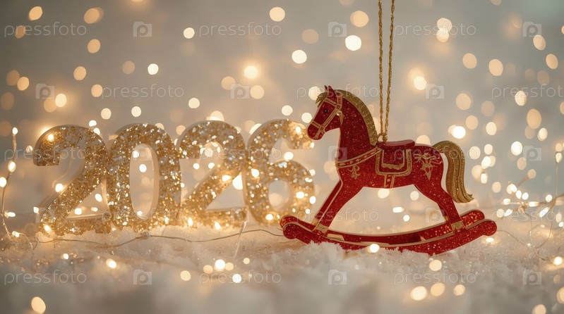 Новогодняя открытка 2026 года с красным огненным конем. Рождественская елка, красная лошадь и фигуры на дереве 2026. украшение интерьера вашего дома в зимние каникулы