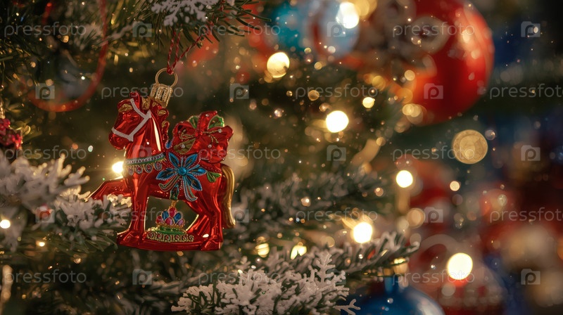 Новогодняя открытка 2026 года с красным огненным конем. Рождественская елка, красная лошадь и фигуры на дереве 2026. украшение интерьера вашего дома в зимние каникулы