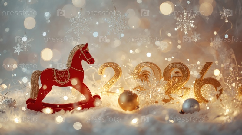 Новогодняя открытка 2026 года с красным огненным конем. Рождественская елка, красная лошадь и фигуры на дереве 2026. украшение интерьера вашего дома в зимние каникулы