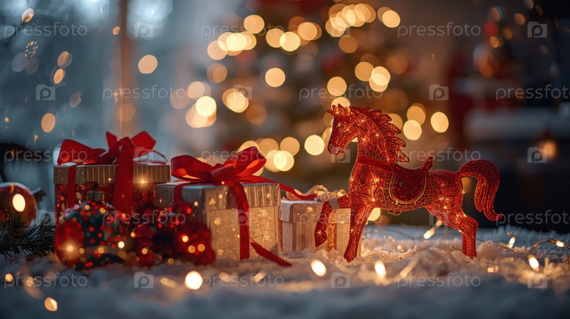 Новогодняя открытка 2026 года с красным огненным конем. Рождественская елка, красная лошадь и фигуры на дереве 2026. украшение интерьера вашего дома в зимние каникулы
