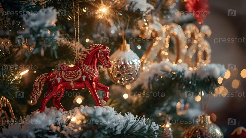 Новогодняя открытка 2026 года с красным огненным конем. Рождественская елка, красная лошадь и фигуры на дереве 2026. украшение интерьера вашего дома в зимние каникулы