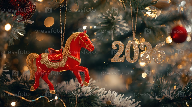 Новогодняя открытка 2026 года с красным огненным конем. Рождественская елка, красная лошадь и фигуры на дереве 2026. украшение интерьера вашего дома в зимние каникулы