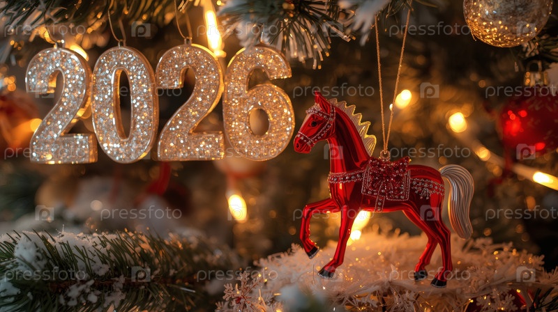Новогодняя открытка 2026 года с красным огненным конем. Рождественская елка, красная лошадь и фигуры на дереве 2026. украшение интерьера вашего дома в зимние каникулы