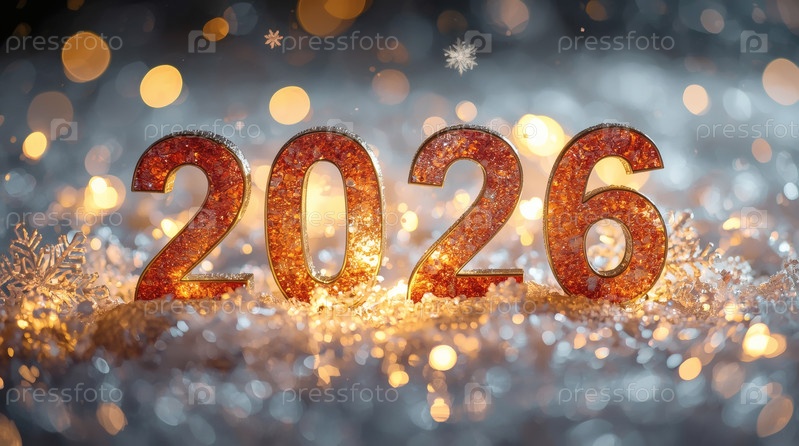 Баннер. блестящие золотые номера 2026 года и красивый боке на красном фоне. с Новым годом и Рождеством