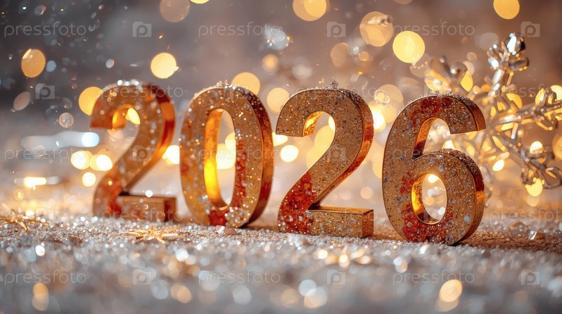Баннер. блестящие золотые номера 2026 года и красивый боке на красном фоне. с Новым годом и Рождеством