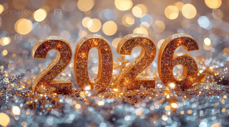 Баннер. блестящие золотые номера 2026 года и красивый боке на красном фоне. с Новым годом и Рождеством