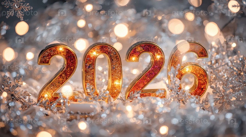 Баннер. блестящие золотые номера 2026 года и красивый боке на красном фоне. с Новым годом и Рождеством